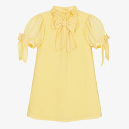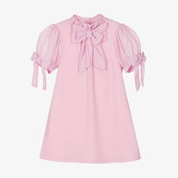 Girls pink crêpe chiffon dress by Angel's Face, featuring feminine bows on the front and cuffs. Made from sheer crêpe chiffon, it has an elasticated, ruffled stand-up collar and puffed sleeves. The dress fastens at the back with golden, heart-shaped logo buttons and is fully lined in soft jersey for extra comfort. Last chance to buy this exquisite dress for special occasions, with limited quantities available.