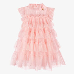 The yellow sparkle tiered dress for girls by Angel's Face is a delightful choice for any special occasion. Crafted with layers of soft, fine tulle, it shimmers with iridescent sequins that catch the light beautifully. The dress features short frilly sleeves, a charming gold heart charm and bow at the neckline, and a convenient keyhole button fastening at the back. Lined with soft jersey, it ensures comfort throughout the day. Limited quantities available, so secure this enchanting piece now.