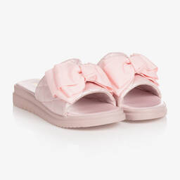 A pretty pair of white quilted sliders for girls by British brand Angel's Face, appliquéd with an eye-catching grosgrain bow. They have super soft faux leather uppers, lightly padded insoles, and a chunky non-slip rubber sole.