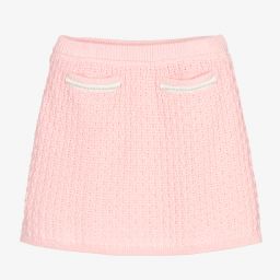 Teen girls yellow skirt from Angel's Face, knitted in soft and mid-weight cotton. Pink braiding and pearl beads decorate the front pockets. Fully lined in super-soft modal jersey, it has an elasticated waistband and ribbed hem.
