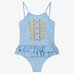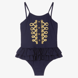 Teen girls white swimsuit from Angel's Face, made in stretchy nylon with SPF 50+ protection. Fully lined, this beautiful one-piece has gold military-style braiding and buttons on the front. It has adjustable shoulder straps and ruffles around the hips.