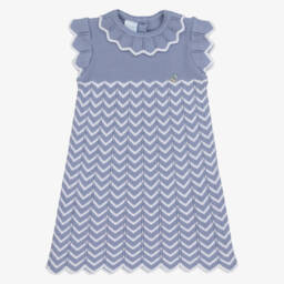 The blue zigzag knit dress for girls by Artesanía Granlei features charming scalloped trims and elegant white zigzag patterns. Crafted from a soft cotton blend, the dress offers a comfortable fit with its capped sleeves and button fastening. Perfect for spring and summer outings, it falls gracefully above the knee, making it both stylish and practical. Limited quantities available, so seize the opportunity to add this delightful piece to the wardrobe today.