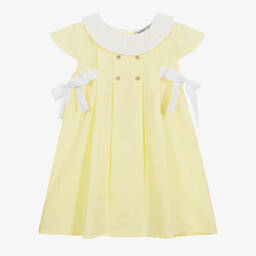 Exclusive to Childrensalon, a pale blue cotton dress for girls by Babidu. Soft and lightweight, it has decorative buttons stitched on the front. The neckline has a white ruffle collar and matching waist ties. There are buttons on the back to fasten.