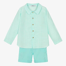 In a lovely shade of bright yellow, this cotton shirt and shorts set for boys is by Babidu. The gingham shirt has a smart pointed collar and traditional wooden buttons for fastening. The shorts have slanted hip pockets and turn-up hems. They fasten with a zip and matching button, and are partly elasticated around the waist for a comfortable fit.