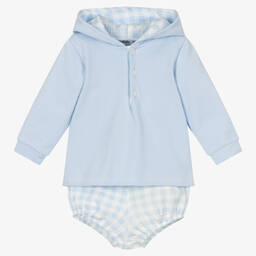 Girls blue and white shorts set by Babidu combines charming design with quality craftsmanship. The knitted cotton fabric feels soft against the skin, featuring a delicate white top with a ruffled blue neckline and matching bloomer shorts with an elasticated waistband for easy dressing. Perfect for spring and summer days, this outfit promises comfort while exuding style. Limited quantities available, ensuring a unique addition to any wardrobe.