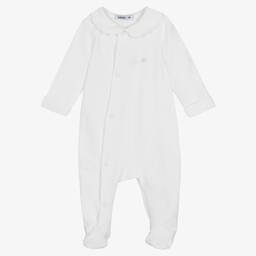 Lovely pale grey babygrow for boys and girls by Babidu, made in waffle-patterned cotton jersey. Soft and comfortable, it has a white scalloped collar with an embroidered grey trim and dots. There is a logo charm sewn on the chest and popper fastenings on the front and down one leg to make dressing easy.