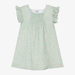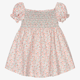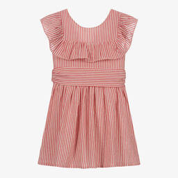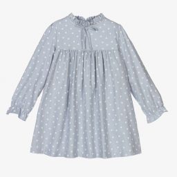 Girls grey, green and burgundy red checked dress from Babidu, made in soft cotton flannel. It has ivory ruffle trims and a burgundy red velvet bow on the bodice. It fastens with buttons on the back and the top half is lined in lightweight cotton.