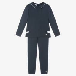 This pale blue trouser set for baby boys and girls by Artesanía Granlei, combines gentle comfort with charming style. Made in a soft knit, the top has a delicate Fair Isle pattern around the shoulders and fastens neatly with buttons on the back. The matching trousers have a comfortable elasticated waistband. Both pieces are finished with delicate picot trims and the brand's mother-of-pearl logo charm for a signature finish.