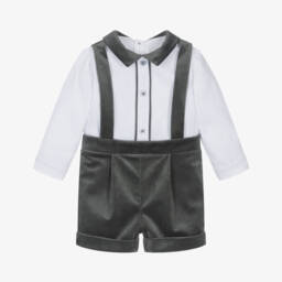 This charming shortie suit for boys by Patachou combines a pristine white cotton top with a navy velour Peter Pan collar and button placket. The velour shorts feature fixed braces and back button fastenings, ensuring ease of dressing. Perfect for any special occasion, this outfit offers both style and comfort. With limited quantities available, it is the last chance to buy this elegant ensemble.