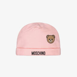 The adorable pink hat for baby girls by Moschino is crafted from soft cotton jersey with a gentle stretch for added comfort. This snug, double-layered accessory boasts the brand's charming Teddy Bear logo on the turned-up brim, complemented by a striking black logo print that adds a touch of designer flair. Ideal for keeping little ones cosy during the chillier months, limited quantities are available, making it a last chance to buy this delightful piece.