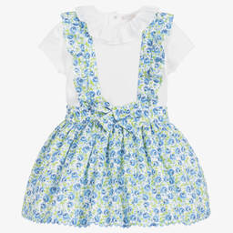 Exclusive to Childrensalon, a pink and white cotton skirt set for girls by British heritage brand Beatrice & George. The soft and comfortable, brushed jersey T-shirt has a large ruffle collar with a pretty picot trim and popper fastenings on the back. The lightweight poplin skirt has a pretty pink and green roses print, with adjustable, buttoned straps and a soft cotton lining.