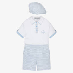 The beige shorts, top, and hat set for boys by Beau KiD features a charming woven design. This delightful ensemble includes lightweight, lined shorts with pockets and an elastic waistband for a comfortable fit. The soft jersey polo shirt boasts an embroidered crest and coordinating blue trims, adding a touch of sporty elegance. Completing the look is a matching flat cap, perfect for spring and summer outings. Limited quantities available, so secure this stylish set today.