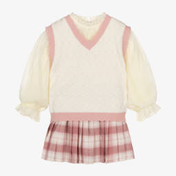 The Navy Blue and ivory outfit set for girls by Beau KiD features a charming set with a soft, mid-weight knitted slipover. The sheer crêpe organza blouse has full puffed sleeves, a ruffle trim, and a pearl effect button fastening. The pleated checked skirt, crafted in lightweight twill, offers comfort with its cotton lining and elasticated waistband. Suitable for autumn adventures, this set is available in limited quantities.