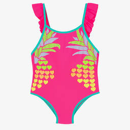 Vibrant aqua green swimsuit for girls by Billieblush, with a silky soft and smooth exterior. Tropical and summery, it has a colourful 'Big Love' slogan on the front, made with shimmering sequins. Ruffled shoulder straps and glittery neon pink trims create a stand-out beach style.