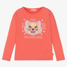 Ivory cotton top for girls by Billieblush. Made in soft and stretchy jersey, there is a cute sparkly cat motif in pink, blue and orange, with star prints and navy blue glitter logo detailing.