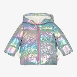 The girls Navy Blue hooded sequin puffer by Billieblush is crafted from silky smooth, durable fabric with a lustrous finish. Featuring multicoloured sequins spelling the designer's name, it includes glittery ribbed cuffs for added charm. Padded for warmth, the coat offers a concealed zip and popper fastening, deep front pockets, and a neon pink-lined hood, ideal for wet weather. Limited quantities available, suitable for cosy adventures.