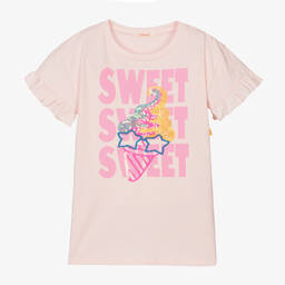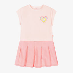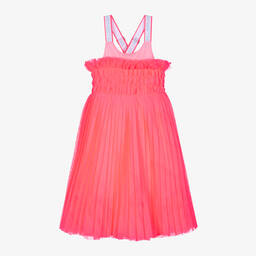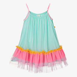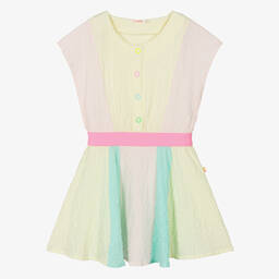 Striped in white and pink, this dress for girls is by Billieblush. It has a delicate, spotted tulle overlay in white, with matching, ruffled shoulder straps and a shimmering, sequinned shell badge on the front.