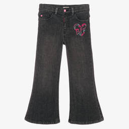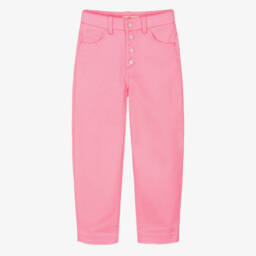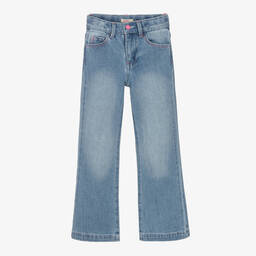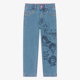 Girls blue denim embroidered jeans by Billieblush, made from soft denim. These regular fit jeans feature a classic five-pocket design, contrast stitched detailing, and vibrant embroidered motifs. The top popper is loose, so may need to be worn with a belt to be held closed.