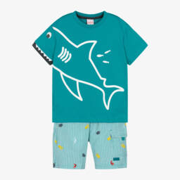 Boys green and beige shorts set from Boboli. The green cotton jersey T-shirt has a colourful binocular print and a crew neckline. The beige cotton shorts have an adjustable waistband, four pockets, and fasten with a zip and popper.