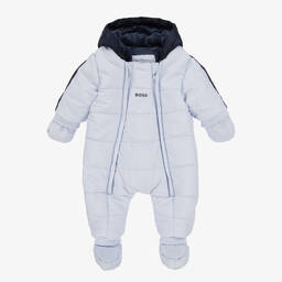 Navy blue with pale blue trims, this softly padded snowsuit for baby boys is by BOSS. For a distinctive look, it features the designer's tonal monogram logo pattern, with a white logo print on the front. Silky smooth and water repellent, it has a warm plush lining and comes with detachable mittens and booties for added cosiness. There's a double zip fastening on the front for easy dressing, with ribbed trims for a snug fit.