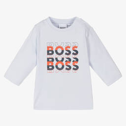 Navy blue cotton top for baby boys from BOSS. Made in soft, comfortable jersey, it has an orange and white repeat logo print on the front. There are popper fastenings on one shoulder for speedy dressing. This garment is made from a minimum of 60% organic cotton.