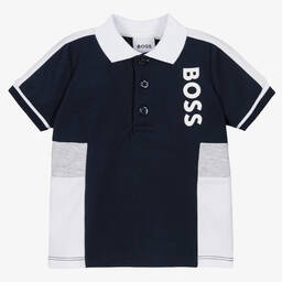 White and blue polo shirt for baby boys from BOSS, made in soft cotton-blend piqué. This classic smart-casual style has navy blue trim on the ribbed collar and across the shoulders, with bright blue trim on the cuffs and coordinating panels on the front. For a designer finish, it has a navy blue logo print on the chest and fastens with branded buttons.