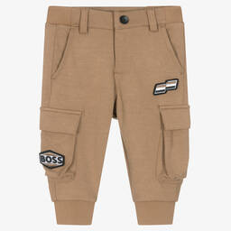 Black joggers for little boys from BOSS, made in soft mid-weight viscose-blend piqué. With a smart twist on a casual design, these comfortable cuffed joggers have pockets on both the front and back, with cargo pockets on the legs. They fasten with a hook and zip on the front and have a comfortable elasticated waistband. For designer appeal, there are logo appliqués on the front with the brand's signature flag tabs on the back.