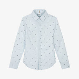 The boys white shirt features an all-over logo pattern, designed by BOSS for a sophisticated look. Crafted from lightweight cotton poplin, it offers comfort and style, with signature logo button fastenings enhancing its appeal. Ideal for spring and summer, this shirt pairs effortlessly with both casual and formal ensembles. Limited quantities available, making it a must-have addition to any wardrobe.
