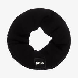 A navy blue snood for boys by BOSS, in a super soft knit with a hint of wool. It has the signature bold black and white rubberised logo on the front for a branded look. The lining is made from cosy polar fleece, designed to keep them warm in the coldest weather.