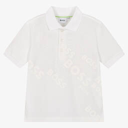 White Mini-me cotton polo shirt for boys by BOSS. Made in soft and stretchy jersey it has a tonal logo print on the front. Classically styled, it has a ribbed collar and cuffs, with vented sides for ease of movement. There are branded button fastenings for a finishing designer touch.