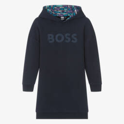 A casual beige dress for girls by BOSS, knitted in the softest cotton and wool blend. This distinctive roll-neck style has a striped design, featuring the brand's signature tricolour for a bold streetwear look. A white BOSS logo is printed on the chest and a glittery tab details the side.