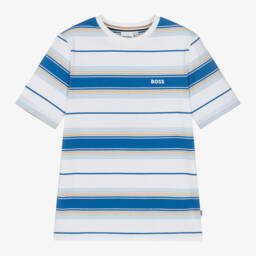 Stylish zip-up top for teen boys by BOSS, with a monogram logo pattern in blue and khaki green. It is made in silky feel jersey, with ribbed trims and co-ordinating stripes along the sleeves for a sporty retro feel. Fastening with an exposed zip and branded pull, it has useful front pockets and a logo tab on the side seam to complete the look.