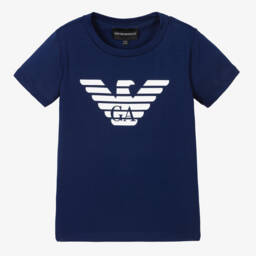 Blue T-shirt for boys by Emporio Armani, made in soft cotton jersey. Combining casual comfort with designer style, this short-sleeved top has the label's distinctive Eagle logo motif on the front in a bold white print.