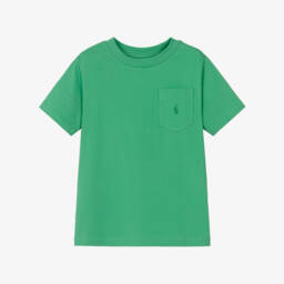 Green short-sleeved T-shirt for older boys by Ralph Lauren, made in soft cotton jersey. Casual and comfortable, it has a single chest pocket with the brand's signature pony logo embroidered in tonal green.