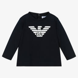 Dark navy blue long-sleeved T-shirt for little boys by Emporio Armani, with a bold Eagle logo print in white on the front. Made in comfortable cotton jersey, it has easy-fastening back poppers to help with dressing.
