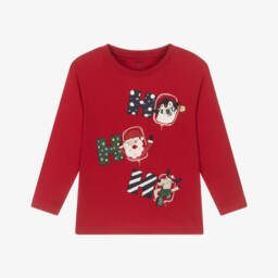 Red long-sleeved T-shirt for little boys by NAME IT, with a cheerful 'Ho Ho Ho' print. Made in soft cotton jersey, this festive top has a cute Father Christmas, penguin and reindeer graphic on the front and a casual crew neckline.