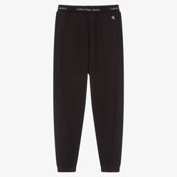 Dark ivory cotton joggers for teen boys and girls by Calvin Klein Jeans. Ideal for relaxing in designer style, the waistband has a black, repeat intarsia logo and there is a monogram logo printed by one of the concealed front pockets. Made in mid-weight jersey, they have a fleecy inside, elasticated cuffs and an inner drawstring on the waist.
