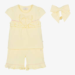 A pink cotton sequin shorts set for girls by Caramelo Kids, made in soft jersey fabric. This charming outfit features a top with short capped sleeves, a decorative bow, and shimmering sequin and ruffle trim on the front. The shorts have matching bows, trims, useful pockets, and a gently elasticated waistband for a comfortable fit. A matching stretchy pink hair scrunchie completes this lovely set. Last chance to buy, limited quantities available.