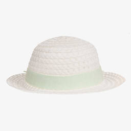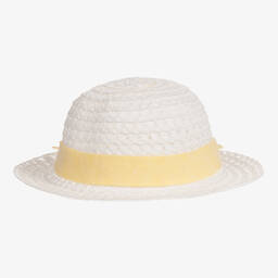 White hat for girls by Caramelo Kids, made from a soft weave with the look of straw. Cool and lightweight, it is trimmed with a pretty pale pink band with a romantic bow on the back.