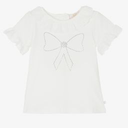 The girls pink diamanté bow T-shirt by Caramelo Kids features a charming diamanté bow on the front, adding a touch of sparkle. Crafted from soft, stretchy cotton jersey, it includes delicate cutwork frills around the neckline and cuffs. The T-shirt is finished with a logo tab on the side seam and popper fastenings at the back for easy wear. Limited quantities available, so this is your last chance to buy this elegant piece.