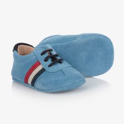 Girls blue suede pre-walker shoes by Children's Classics, exclusive to Childrensalon. Made from soft suede leather with a cosy leather lining, these shoes feature charming red, ivory, and light blue ribbon stripes on the sides. The flexible suede leather outer sole and red lace-up fastening ensure comfort and easy wear. Perfect for early steps, providing both style and support. Limited quantities available, last chance to buy!