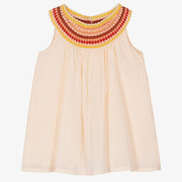Gorgeous mustard yellow sleeveless dress for little girls, designed by French luxury brand Chloé. Woven in beautifully soft cotton, it has a relaxed floaty shape and a tonal logo delicately embroidered near the hem. The bohemian-inspired collar has charming dark pink and mustard yellow macramé trims. With attention to all the small details, the back button fastenings are embossed with the brand's logo for a discreet branded finish.