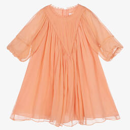 Mini-me yellow dress for girls by French designer Chloé, made in luxurious, textured silk chiffon. With a gathered V-shaped bodice, it has a raw-edged, stand-up frill around the neckline and a concealed zip fastening on the back. The full, mid-length sleeves are gently elasticated at the cuffs for added volume. Fully lined in soft cotton voile, this beautiful dress has the designer's name above the hem in tonal embroidery for a discreet designer finish.