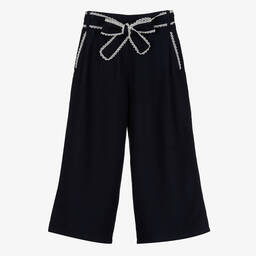 Super stylish ivory Mini-me trousers for teen girls by luxury French designer Chloé, with wide legs. Made in a linen and cotton twill blend, they have pretty, embroidered ivory Guipure lace trims on the attached front sash and jetted pockets. The waistband is elasticated around the back for a comfortable fit and has a subtly embroidered logo on one side.
