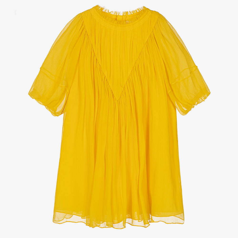 Beautiful yellow chiffon Mini-me dress for teen girls by luxury French designer Chloé, with a feminine, floaty feel. Made in luxurious, textured silk, it has a raw-edged, stand-up frill around the neckline, with a gathered V-shaped bodice and gathers below. The full, mid-length sleeves have gently elasticated cuffs and there is a neat, concealed zip fastening around the back. It is fully lined in cotton voile for comfort.