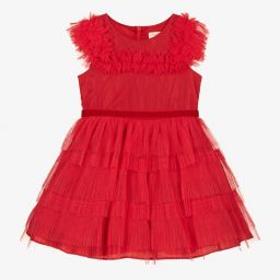 A special occasion pink dress for girls by British brand David Charles. Made in layers of soft tulle, there are lovely plissé ruffles on the bodice and skirt. It has a removable grosgrain ribbon sash on the waist, a silky lining with layers of tulle for added volume, and a zip fastening on the back