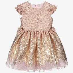 Girls special occasion dress in pink and gold by British designer David Charles. Made in shiny jacquard, it has an elegant, wide neckline and ruffled, capped sleeves. The gathered skirt has bows on the waist and a band of glistening gold flowers around the pink organza hemline. The pink cotton lining has a tulle frill for extra volume.