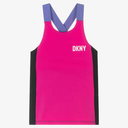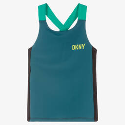 Sporty teal blue and black top for girls by DKNY, with lime green logo prints on the front and back. It is made in comfortable stretchy nylon jersey with elasticated, cross-over green shoulder straps for a great fit.
