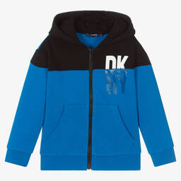 Boys green cotton zip-up hoodie by DKNY features a bold, embroidered varsity-style logo appliqué on the front. Crafted from soft, mid-weight sweatshirt cotton jersey, this sporty hoodie has handy concealed side seam pockets and white stripes on the ribbed cuffs and hem. It fastens with an exposed, branded zip on the front. Limited quantities available; it's the last chance to buy for a stylish spring and summer wardrobe addition.