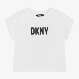 Girls white organic cotton T-shirt by DKNY, made from soft jersey. Featuring a bold black logo on the front, it offers a distinctive designer look. This casual and comfortable piece is styled in a boxy fit with seamless, capped short sleeves. Perfect for everyday wear, it ensures comfort with its soft, breathable fabric. Limited quantities available—last chance to buy this stylish T-shirt.